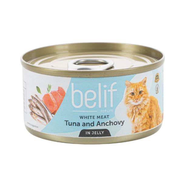 belif, מזון רטוב, מעדן בטעם טונה ואנשובי בג'לי, לחתול בוגר, 80 גרם