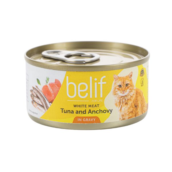 belif, מזון רטוב, מעדן בטעם טונה ואנשובי ברוטב, לחתול בוגר, 80 גרם